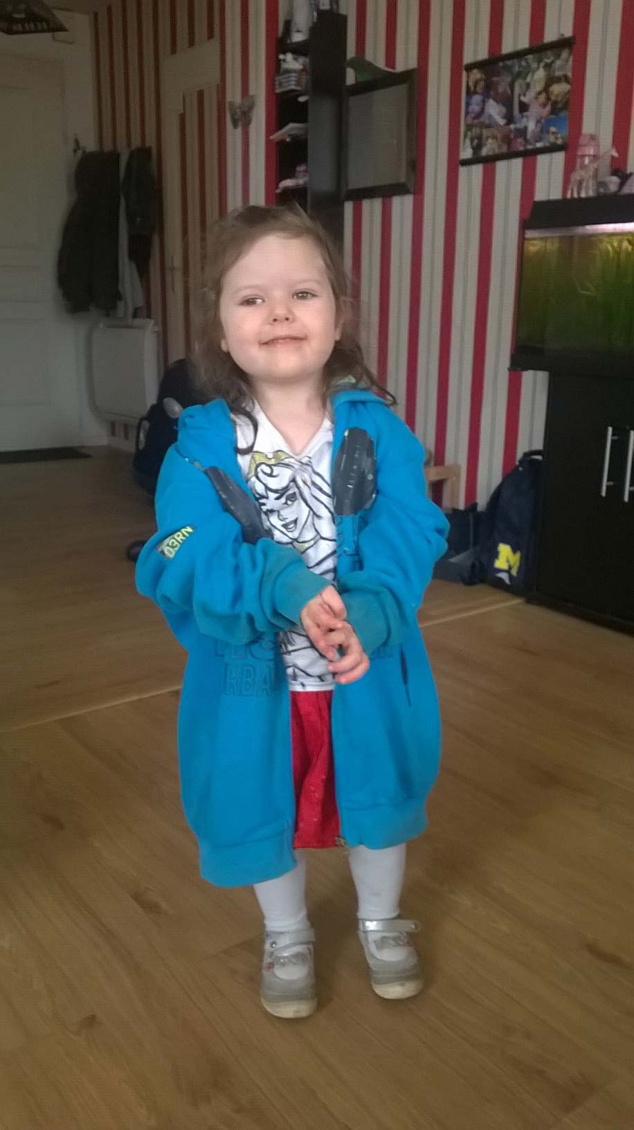 Maëlle enfile toute seule le gilet de son frère. Ensuite elle vient me voir avec son plus beau sourire et me dit :