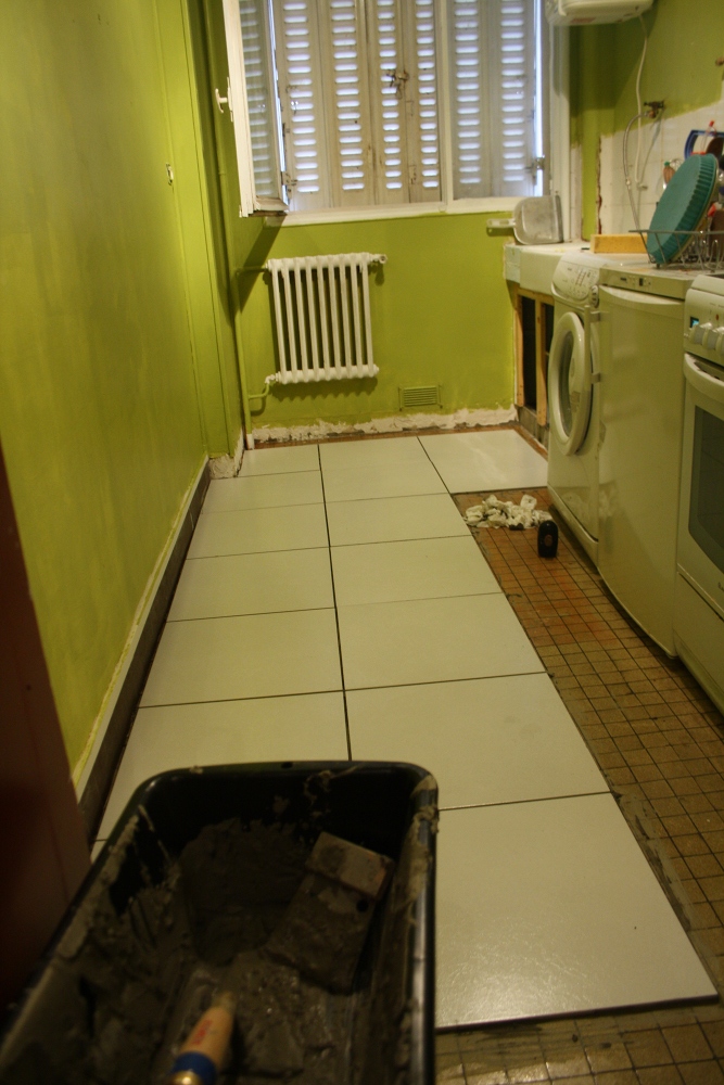Pas vraiment compliqué mais nécessite pas mal de préparation. résultat : une demi cuisine posé en une demi journée : pas si mal pour le rendement (en espérant que le mortier colle collera bien :p )