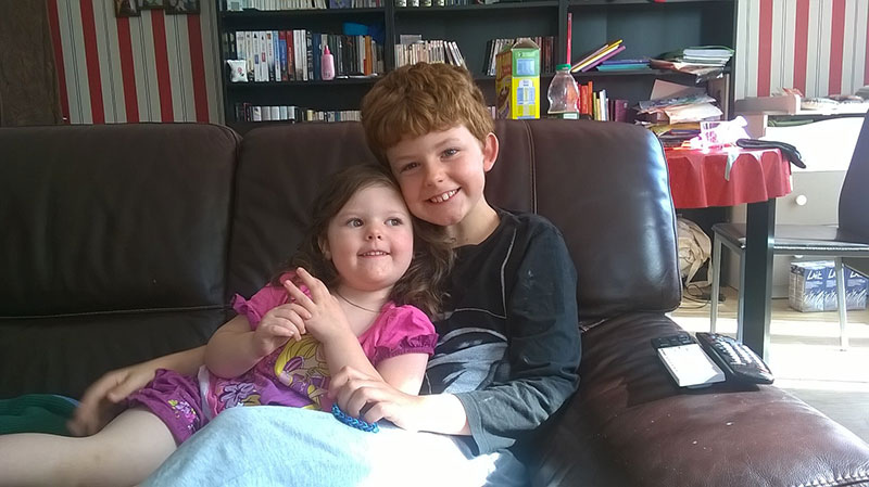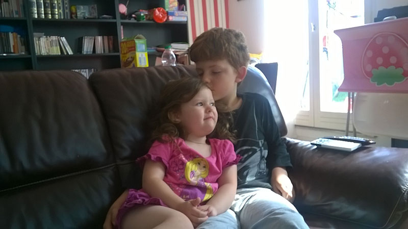 Maëlle se réveille de très bonne humeur (à 10h30) et cours dans les bras de son frère sans un bisous ou regard vers ses parents ;)